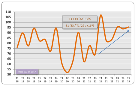 Au premier trimestre 2023, l’indice des équipements d’investissement a enregistré une croissance en glissement annuel de 16% mais une croissance séquentielle de 2% seulement, et qui dissimule des orientations différenciées, d’après les enquêtes de conjonctures menées par Acsiel.