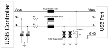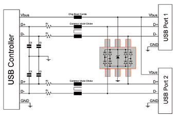 Comme on le voit sur la figure 3, deux lignes de signaux différentiels (D+ et D) sont routées du connecteur à la diode TVS, puis vers le contrôleur USB via le self de mode commun. On obtient de cette façon une remarquable protection ESD et un bon filtrage de la paire de données. Le VBUS est routé vers la ferrite CMS via la diode TVS. En aval de la ferrite CMS, il est possible d’utiliser un condensateur supplémentaire et une autre ferrite CMS pour obtenir la meilleur atténuation possible en filtre PI.