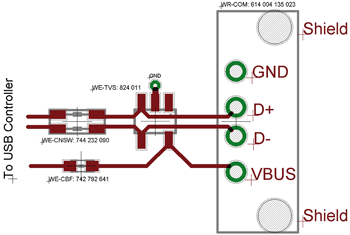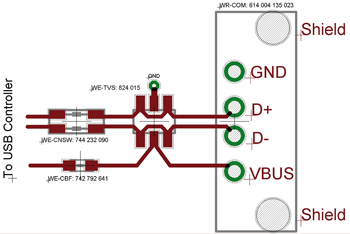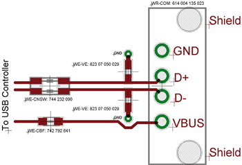Les développeurs préférant des protections à une voie peuvent utiliser une protection ESD de la série WE-VE. Celle-ci doit toujours être connectée au D+/D- vers le GND. Les autres composants sont connectés comme illustré ici.