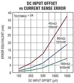 Les mesures de courant directes perturbent le circuit puisqu’une résistance de mesure est mise en série avec la charge pour générer une chute de tension proportionnelle au courant de charge suivant la loi d’Ohm. Le choix de la résistance de mesure est un compromis entre la puissance dissipée dans la résistance et la précision de la mesure du courant. Pour éviter de dissiper trop de puissance dans la résistance de mesure, elle doit être la plus petite possible, tout en permettant de détecter un signal de courant minimum. Le signal minimum reproduit avec précision est limité principalement par le décalage à l’entrée DC du circuit de mesure (voir courbe).