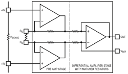 Les amplificateurs d’instrumentation peuvent être considérés comme un amplificateur différentiel avec un étage préamplificateur (voir figure 2b) qui offre une plus grande flexibilité, avec un gain variable fixé par une résistance externe. Le préamplificateur présente une impédance d’entrée très élevée qui minimise la charge sur le bus d’alimentation, et rend possible la mesure de courants de système plus faibles qu’avec un amplificateur différentiel. Un inconvénient est que la tension de mode commun est normalement limitée à la tension d’alimentation.