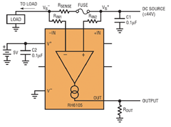 De plus, le RH6105 présente une plage de tension d’entrée différentielle de ±44V, qui lui donne la possibilité de contrôler une tension en présence d’un fusible ouvert ou d’un interrupteur comme indiqué figure 4. De même, si un court-circuit apparait au niveau de la charge, le dispositif ne sera pas endommagé et le courant sera limité à quelques milliampères.