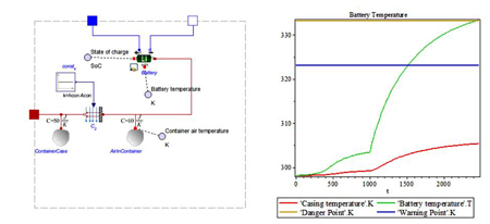 Les modèles de batteries obtenus peuvent également servir à prédire les taux de charge/décharge, l’état de charge (EDC), l’énergie thermique produite et l’état de santé (EDS) par le biais d’un grand nombre de cycles de charge dans des modèles de systèmes complexes multi-domaines. Cette approche fournit les performances nécessaires pour les études au niveau système avec une perte minimale de fidélité du modèle. L’utilisateur peut également autoriser les pertes énergétiques dues à la chaleur, rendant ces modèles utiles pour effectuer des études thermiques et déterminer la taille des composants des systèmes de refroidissement afin de gérer la température de la batterie. L’absence de maîtrise rigoureuse de la température est susceptible d’affecter la durée de vie de la batterie ou, dans le pire des cas, d’en provoquer la destruction voire l’explosion sous l’effet d’un emballement thermique : c’est là un problème courant dans de nombreux systèmes alimentés par batterie.