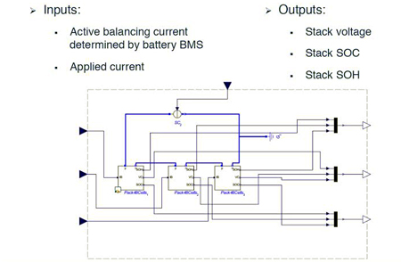 Le modèle d’empilement comporte 18 sous-systèmes de cellules reliés soit en parallèle, soit en série, selon les exigences. Les signaux d’entrée sont prévus pour l’équilibrage de charge en provenance du SGB. Les signaux de sortie sont renvoyés au SGB pour surveiller l’état de l’empilement (tension d’alimentation, état de charge et état de santé). Enfin, le SSE complet est constitué de plusieurs empilements avec des signaux d’entrée/sortie acheminés depuis et vers le SGB.