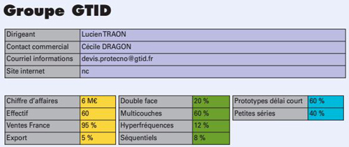 L’activité circuit imprimé du groupe GTID se positionne principalement sur le marché du circuit technologique (Protecno situé à Brest (29) depuis près de 40ans). Ses compétences en prototypes -petites séries : circuits imprimés multicouches, flex-rigide, hyperfréquence couvrent aujourd’hui, les marchés des secteurs défense ,aéronautique, télécommunications, informatique, tout en proposant une prestation délai court. Sur la spécificité de la clientèle industrielle, sn Peci (22) basé à Perros Guirec, répond à cette demande dans le créneau du prototype.