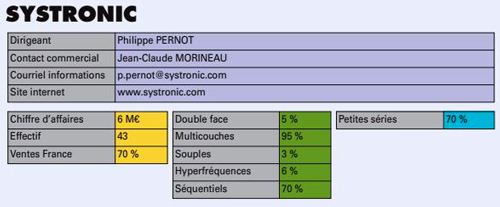 Fabricant de circuits imprimés pour l’aéronautique et le spatial, Systronic poursuit son développement dans le domaine des applications de haute fiabilité. Ce développement s’accompagne d’investissements importants dans toutes les technologies du PCB ainsi que d’un effort de R&D accru dans le domaine du HDI. L’année 2010 s’est déroulée conformément aux prévisions et les investissements se sont intensifiés. Qualifications CNES, ESA, EN9100.