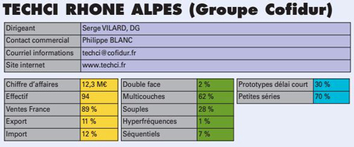 La production vendue représentait un chiffre d’affaires d’environ 159 M€ et employait environ 1680 personnes. En 2010, ce sont 29 sites qui se sont partagés environ 161 M€ en employant un peu plus de 1500 personnes. Les deux grands groupes ELVIA Pcb et CIRE se seront partagé 50% de la production française. TechCi réalisa plus de 12M€ sur son site de Saint-Genix-sur-Guiers soit 7% de la production nationale. Cinq ateliers sont entre 5 et 7M€ soit 19% de la production française. Les 24% restants auront été réalisés par 14 usines. La reprise entamée en 2010 pour environ 2% du chiffre d’affaires semble, à la lecture des commentaires rédigés par les dirigeants de ces entreprises, se poursuivre pour l’année 2011.