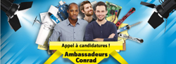 Cette année, Conrad recherche trois Ambassadeurs : un Bricomaker (soudage, bricolage, installation électrique, impression 3D ), un Robogrammeur (construction de robots, programmation, domotique) et un Pilotesteur (construction d’avions, de voitures, de bateaux radiocommandés...).