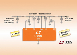 Linear Technology Corporation présente le LTC7812, un régulateur DC/DC, synchrone, à faible courant de repos, à sortie double (modes élévateur + abaisseur). Mis en cascade, les contrôleurs indépendants, en mode élévateur et en mode abaisseur, régulent la tension de sortie, la tension d’entrée pouvant être supérieure, inférieure ou égale à la tension de sortie, maintenant la régulation de la tension de sortie dans les conditions de démarrage à froid et de rupture de charge. Contrairement aux régulateurs conventionnels, abaisseurs-élévateurs, à une seule inductance, la solution LTC7812, où les deux contrôleurs abaisseur + élévateur sont en cascade, procure une réponse rapide aux transitoires, avec des courants d’entrée et de sortie, continus, non pulsés, réduisant fortement l’ondulation de la tension de sortie et les interférences électromagnétiques (IEM), ce qui le rend approprié aux dispositifs de l’automobile, de l’industrie et ceux fonctionnant sur alimentation de forte puissance.