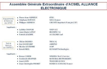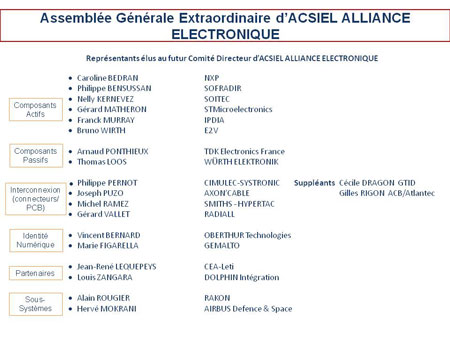 Le nouveau syndicat a élu son comité directeur et son président. Gérard MATHERON, actuel Président d’ACSIEL et Directeur du site de recherche avancée et de production de STMicroelectronics à Crolles, a été élu à l’unanimité Président de la nouvelle entité et a déclaré « L’objectif est clair : pour les adhérents actuels et futurs l’attractivité du nouveau syndicat doit être une évidence. Car l’un des enjeux est que le nouvel ensemble plus représentatif de la filière électronique –composants, systèmes, machines de production, services, test et mesure- soit un lieu d’échanges, d’informations, de collaborations fructueuses ».