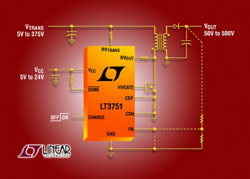 Le LT3751 peut être configuré en détection de la tension de sortie au primaire pour la régulation sans avoir recours à un photocoupleur. Pour des applications de régulation plus précise et à niveau de bruit inférieur, un diviseur de tension résistif sur la sortie peut servir à réguler la tension de sortie, ce qui lui permet de répondre aux demandes d’alimentations de forte tension.