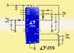 Linear Technology Corporation annonce le LTC3570, un régulateur abaisseur-élévateur, 36 V, intensité de commutation ISW de 1,5 A, combiné avec un contrôleur linéaire, dans un boîtier QFN, 4 mm x 4 mm, ou TSSOP-20E. Le LT3570 fonctionne à partir d’une gamme de tensions d’entrée de 2,5 V à 36 V (40 V max.), ce qui le rend idéal dans les conditions de rupture de charge et de démarrage à froid que l’on rencontre communément dans les applications de l’automobile.