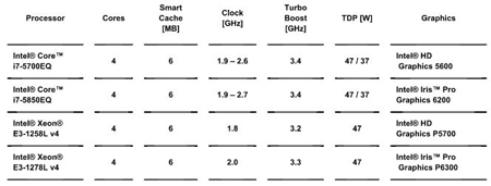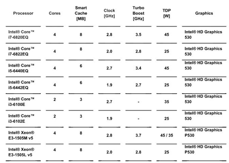 En parallèle avec les 5e et 6e génération de processeurs Intel® Core (anciens noms de code Broadwell et Skylake), les processeurs Intel Xeon sont également disponibles sur cette même microarchitecture. Ils sont fabriqués en process 14 nm et intègrent un CPU et un GPU dans un module multi-chip BGA robuste petit format (taille du CPU Gen 5 : 37,5 mm x 32 mm x 1,8 mm).