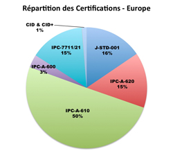 Toutes certifications confondues, 204.500* personnes sont certifiées IPC dans le monde dont 25 % en Europe. La certification la plus répandue est de loin l’IPC-A-610 « Acceptabilité des assemblages électroniques ».