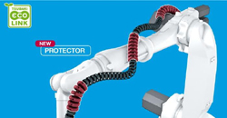 Ces robots perfectionnés et précis on des vitesses et des accélérations de plus en plus élevées. Ces nouveaux paramètres ont imposés aux fabricants la nécessité de trouver un moyen fiable pour garantir la durée de vie des différents câbles électriques et tuyaux, soumis eux aussi à de fortes contraintes. Tsubaki KabelSchlepp a développé sur sa série de chaîne porte-câble ROBOTRAX pour mouvements tridimensionnels des protecteurs efficaces leur garantissant une grande durée de vie.