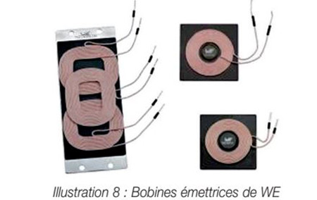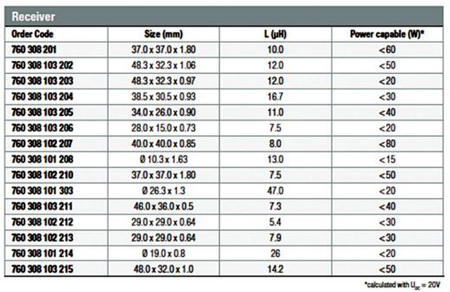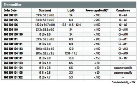 Würth Elektronik eiSos, en tant que membre du Wireless Power Consortium (WPC) et de l‘Alliance for Wireless Power (A4WP) connue aujourd’hui sous le nom de « Rezence », a mis au point, comme solution propriétaire, différentes bobines émettrices et réceptrices sans fil compatibles avec le standard Qi. Quelques bobines émettrices et réceptrices sont représentées ci-après.