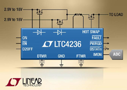 Linear Technology Corporation présente le LTC4236, un contrôleur Hot Swap simple et un double circuit OU à diodes idéales, à sortie gestionnaire du courant dans la charge. Les dispositifs de grande disponibilité – serveurs, routeurs de réseaux, SSD (disque informatique à mémoire flash) - alimentent les cartes de circuits à partir de plusieurs modes d’alimentation. Le LTC4236 associe (des circuits OU à diodes) deux alimentations et assure le contrôle des courants d’appel, la protection contre les surintensités et la gestion du courant, le tout dans une empreinte compacte. Dans la fonction OU de l’alimentation, les MOSFET canal N à faibles pertes remplacent les diodes Schottky de puissance et les radiateurs, ce qui réduit la chute de tension, les pertes de puissance et la surface de la mise en œuvre. Le MOSFET Hot Swap, en aval, facilite, en toute sécurité, l’insertion et le retrait à chaud d’une carte, sur des fonds de panier, et protège contre les courts-circuits par un interrupteur rapide à intensité limitée. Un signal de sortie, référencé à la masse, à faible tension de décalage de zéro, permet la mesure de l’intensité du courant dans la charge via un convertisseur analogique-numérique externe.