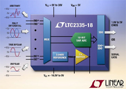 Chaque entrée peut être configurée par le logiciel SoftSpanTM pour une conversion par conversion et en acceptant de vrais signaux bipolaires en entrée de ±10,24V, 0V à 10,24V, ±5,12V ou 0V à 5,12V. Le séquenceur intégré permet la programmation d’un cycle du LTC2335-18 via une séquence de canaux et de gammes, sans intervention ultérieure de l’utilisateur. La gamme de tension en mode commun des entrées analogiques différentielles, de -16,5V à 34V, permet la numérisation directe d’une grande variété de signaux par le CAN afin de simplifier la conception de la chaîne du signal. La souplesse du signal d’entrée, associée à un rapport signal sur bruit inégalé SNR de 96,7dB et une vitesse d’échantillonnage de 1Méch./s, rend le LTC2335-18 approprié au contrôle de processus industriels de grandes performances, aux applications de test et de mesure, de gestion de l’alimentation des lignes et de l’instrumentation.