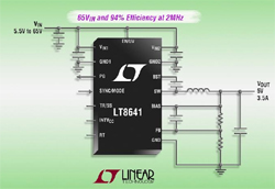 Les commutateurs internes du LT8641, de haut rendement, peuvent fournir un courant continu de sortie jusqu’à 3,5A et des pics d’intensité de charges de 5A, pour des tensions aussi basses que 0,81V. Le fonctionnement en Burst Mode ® du composant permet de maintenir le courant de repos inférieur à 2,5µA, en veille et à vide, ce qui convient aux applications comme les systèmes « connectés en permanence » de l’automobile, qui nécessitent une durée de vie accrue de la batterie. La conception particulière du LT8641 maintient une tension de déchet minimum, de seulement 130mV à 1A, dans toutes les conditions de fonctionnement, lui permettant de répondre à tous les scénarios, tel le démarrage à froid des véhicules.