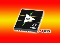 Linear Technology présente le LT5554, un amplificateur FI à gain programmable numériquement, large bande, présentant un OIP3 (point d’interception de sortie du 3ème ordre) de 48 dBm à 200 MHz. De plus, l’amplificateur présente un très faible niveau de bruit pour une très grande gamme dynamique des récepteurs de télécommunications sans fil et des systèmes de traitement du signal. Son gain est contrôlé numériquement de 2 dB à 18 dB par un mot de 7 bits parallèles, ce qui procure des pas aussi fins que 0,125 dB pour le contrôle du gain, la plus petite valeur des amplificateurs de ce type.