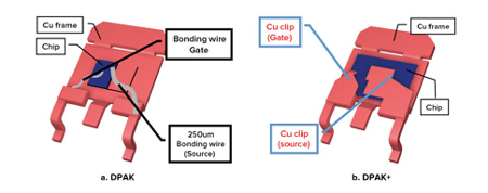 Les améliorations apportées par les toutes dernières puces silicium UMOS IX-H, par rapport à la génération UMOS VIII, ont permis de réduire de 42% la résistance électrique de la puce. Toshiba a lancé des transistors MOSFET canal-N 30V et 60V suite à l’introduction de sa technologie UMOS IX-H. Les dispositifs 30V présentent une RDS(ON) ultra-faible de 0.6 mΩ (maxi) pour VGS = 10V, et un COSS.typique de 2160 pF. Pour les MOSFET 60V, la RDS(ON) est de 1.3 mΩ et le COSS typique est de 960 pF. La technologie des boîtiers franchit une étape Les seules améliorations au niveau silicium, ne sont cependant pas suffisantes pour réaliser les progrès exigés par les marchés actuels. Des boîtiers plus avancés sont également nécessaires, non seulement pour minimiser les résistances électriques, mais aussi pour assurer une faible résistance thermique entre la jonction et l’extérieur, afin de permettre au dispositif de supporter un courant opérationnel plus élevé. Ces boîtiers donnent ainsi naissance à des systèmes plus compacts, avec une densité de puissance supérieure, qui permettent aux concepteurs d’imaginer des produits finaux plus petits et plus minces, sans compromettre la fiabilité globale. Les principaux développements de boîtier cherchent à améliorer le refroidissement et à éliminer les faiblesses connues des boîtiers de puissance traditionnels, comme les connexions "wirebond" (liaisons à fils) reliant la puce au "leadframe" . Ces wirebonds limitent la capacité de transport de courant, et sont aussi sujets à défaillance. Un nouveau boîtier de puissance DPAK+ a été développé, qui a les mêmes dimensions et la même forme que le DPAK conventionnel, mais utilise des "copper clips" (clips cuivre) pour connecter les broches grille et source directement aux électrodes métallisées de la puce. Ces clips cuivre se substituent aux fils de liaison en aluminium, et bénéficient d’une section importante et d’une plus grande zone de contact sur la puce. Ceci a permis une amélioration majeure de la résistance électrique du boîtier, et une réduction importante de la résistance de contact. Ceci réduit sensiblement les pertes RI2 liées au boîtier, et autorise aussi un courant maximum plus élevé. En outre, le rendement thermique et la fiabilité globale se trouvent améliorés. La Figure 1 compare les connexions de grille et de source plus efficaces de type "copper clip", aux liaisons "wirebonding" traditionnelles.