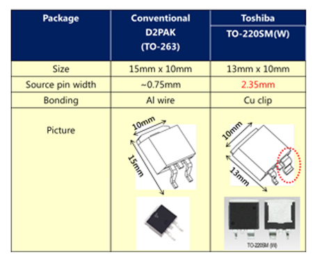 Le boîtier de puissance TO-220SM(W), qui dispose aussi de la technologie copper-clip, a la même forme qu’un D2PAK(TO-263) classique, mais avec une broche source plus de trois fois plus large. Ces améliorations boostent le courant nominal maximum à 200A, tout en réduisant de plus de 13% la place occupée sur la carte, avec seulement 13 x 10 mm.