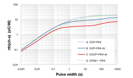 Le test comparé d’un DSOP Advance face à un SOP classique montre une amélioration de 26% de la résistance thermique (RTH). dynamique. La Figure 3 compare la RTH dynamique des deux boîtiers lorsque des courants de test avec des durées d’impulsion variables traversent le dispositif.
