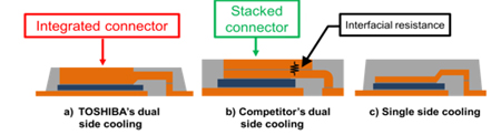 La Figure 4 compare la coupe transversale du DSOP Advance à celle du SOP classique et à celle d’un boîtier bi-face concurrent. La structure du boîtier concurrent ressemble beaucoup à celle du SOP classique, et utilise un connecteur empilé pour exposer la zone de contact sur la surface supérieure. Ce type de structure induit des résistances thermiques d’interface entre les éléments de la pile, comme indiqué, alors que DSOP Advance avec son connecteur intégré d’un seul tenant offre un meilleur rendement thermique.