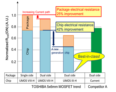 L’analyse des effets combinés de la technologie MOSFET UMOS IX-H et du DSOP Advance montre une amélioration de plus de 35% de RDS(ON), comme illustré en Figure 5.