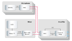 Le système génère un son d’ambiance 5.1 haut de gamme. Il intègre une interface d’application USB. Tous les autres nœuds sont contrôlés à distance et paramétrés via une interface I2C distante. Cette approche centrale simplifie le développement logiciel. Un des autres avantages est le faible coût du matériel, avec un seul microcontrôleur sur tout le réseau et aucune programmation nécessaire. Ce système est la preuve que MOST150 peut être très rentable, en plaçant toute la puissance de traitement nécessaire dans un seul nœud et en simplifiant les autres nœuds du système.