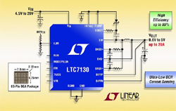 L’architecture unique du composant facilite la compensation et offre la possibilité de mettre directement en parallèle plusieurs circuits intégrés afin d’obtenir un courant plus élevé. Il améliore aussi le rapport signal sur bruit du signal de mesure du courant, permettant l’emploi d’une inductance de puissance à très faible résistance en continu (DC) afin de maximiser le rendement dans les applications de forte intensité. Cette caractéristique réduit également la gigue de commutation généralement rencontrée dans les applications à faible DCR et améliore la précision de la limite du courant. La gamme de tension d’entrée du LTC7130, de 4,5V à 20V, convient à une grande variété d’applications, incluant la plupart des tensions de bus intermédiaires, et est compatible avec de nombreux types de batteries. Les MOSFET canal N, intégrés, peuvent fournir des courants continus à la charge, aussi élevés que 20A pour des tensions de sortie de 0,6V à 5,5V, ce qui le rend approprié pour les applications de point de charge comme les conceptions de référence à base de DSP / FPGA / ASIC, de forte intensité et basse tension. Les autres applications comprennent les systèmes de télécommunications, de transmission de données, les architectures d’alimentation distribuée et, en général, les dispositifs requérant de fortes puissances.