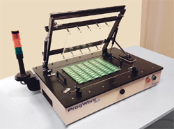 La taille et la complexité des cartes ont présenté un défi considérable pour l’équipe de production de ELDAT. Les cartes contenant l’émetteur-récepteur radio sont montées sur des panneaux, contenant chacune 60 cartes et mesurant 212,904 x 282,194 mm, Les composants programmés sont un mélange de microcontrôleurs SiLab C8051F901 et Microchip PIC10F202. Dans un premier temps, les composants étaient programmés manuellement, un processus extrêmement long qui a conduit ELDAT à chercher des solutions alternatives.