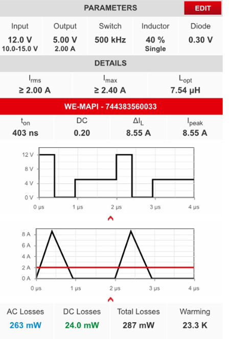 La toute dernière extension de RED EXPERT permet désormais aussi de calculer précisément les pertes dans les inductances pour les régulateurs mixtes en mode de conduction continue. De plus, les utilisateurs inscrits peuvent comparer toutes les inductances observées dans un tableau clair et sur différents diagrammes. Autre innovation : on peut calculer les pertes dans l’inductance de stockage quelle que soit la topologie du régulateur.