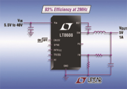 Linear Technology Corporation annonce le LT8608, un régulateur à découpage, abaisseur, synchrone, 1,5A, 42V en entrée. Une architecture unique à redressement synchrone fournit un rendement de 93%, tandis que la fréquence de commutation de 2MHz permet aux concepteurs d’éviter les bandes de fréquences sensibles au bruit, comme la bande AM de la radio, et ceci dans une solution d’empreinte très compacte. Le fonctionnement en Burst Mode ® permet de garder le courant de repos inférieur à 2,5μA, en veille et à vide, ce qui convient aux systèmes toujours sous tension. Sa gamme de tensions d’entrée, de 3,0V à 42V, le rend approprié aux applications de l’automobile où la régulation doit être maintenue dans les cas de démarrage à froid et d’arrêt / démarrage, avec des tensions d’entrée minimum aussi basses que 3,0V, et en cas de rupture de charge avec des surtensions de plus de 40V.