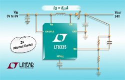Il fonctionne à partir d’une gamme de tensions d’entrée, de 3V à 25V, convenant à une large gamme de sources d’entrée allant d’un élément Li-ion aux tensions d’entrée pour l’automobile. Le LT8335 peut être configuré en convertisseur élévateur, SEPIC ou inverseur. Il utilise une fréquence de commutation fixe de 2MHz, ce qui permet aux concepteurs de réduire la taille des composants externes et d’éviter les bandes de fréquences sensibles, comme la bande radio AM. Le fonctionnement en Burst Mode® réduit le courant de repos à seulement 6µA et maintient l’ondulation de la tension de sortie inférieure à 15mVcrête-à-crête. La combinaison d’un boîtier DFN, 3mm x 2mm, et de petits composants externes assure une empreinte très compacte et réduit le coût de la réalisation.