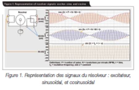 Comme l’indique la Figure 1, un capteur de résolveur comprend un enroulement de rotor (R1-R2) avec l’onde sinusoïdale de l’excitateur couplée en courant alternatif à deux enroulements de stator. Les enroulements de stator, une bobine en régime sinusoïdal (S2-S4) et une bobine en régime cosinusoïdal (S1-S3), sont positionnés mécaniquement à un déphasage de 90 degrés. Lorsque le rotor tourne, l’angle de position du rotor (È) change par rapport aux enroulements du stator. Le rapport du nombre de tours des enroulements du rotor et du stator est de l’ordre de 30 %. Les signaux à modulation d’amplitude résultant présentés en Figure 1 correspondent aux signaux typiques de sortie du résolveur. Ces signaux doivent être obtenus, démodulés et post-traités pour extraire les informations relatives à l’angle et à la vitesse.