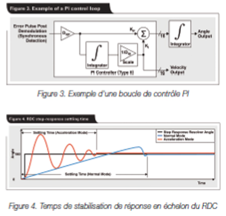 Généralement, la boucle de suivi numérique constitue le composant le plus critique de l’architecture du RDC qui détermine la vitesse à laquelle cela peut arriver. Pour déterminer le comportement de la boucle de suivi, il est important de comprendre un terme important : le temps de stabilisation. Lorsque le signal de sortie du résolveur varie rapidement, la réponse indicielle du convertisseur est déterminée par la marge de phase et la marge de gain de la boucle de contrôle. [3] Le temps de stabilisation est un indicateur de performance rapide du système de contrôle du RDC. La Figure 4 présente un exemple de temps de stabilisation d’un système de contrôle de rétroaction de RDC avec une variation d’entrée en échelon indiquée en noir. Le signal bleu représente une réponse en mode normal pour le circuit de la Figure 3 et le signal rouge correspond à la réponse pendant le mode d’accélération (variation angulaire rapide), décrit en page suivante.