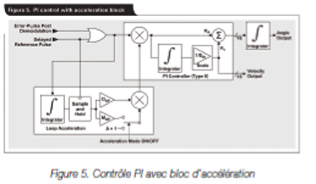 constante. La sortie du comparateur différentiel est une donnée numérique qui est directement entrée dans les blocs numériques afin d’éliminer l’onde porteuse ou le composant sin ùt avec un circuit de détection synchrone. Ce bloc de détection synchrone utilise le signal de rétroaction de l’excitateur comme référence. La sortie résultante, VφERR, passe dans la boucle de contrôle de suivi numérique pour générer la sortie de l’angle désirée.