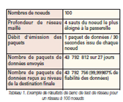 La fiabilité de centaines de topologies de réseaux est vérifiée à l’aide du banc de test. Le réseau suivant (tableau 1), par exemple, a été mis en oeuvre pour effectuer le test de performance d’un réseau à 100 noeuds et à quatre sauts classiques. Chaque noeud générait 2 paquets de données par minute et le réseau a fonctionné pendant un minimum de 500 heures (sur 21 jours). L’environnement simule une installation commerciale ou industrielle légère classique, avec présence d’équipement électronique, de structures métalliques et de personnes se déplaçant dans tout le bâtiment. Malgré les pertes dues à l’environnement RF, le réseau, a pu atteindre une fiabilité de données supérieure à 99,999% au cours de l’envoi de plus de 43 millions de paquets de données, en multipliant les relances de paquets et en utilisant la diversité de chemin et de canaux.