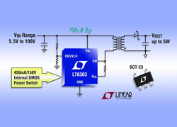 Linear Technology Corporation annonce le LT8303, un régulateur à récupération d’énergie (flyback), monolithique, en boîtier TSOT-23, qui simplifie, de façon significative, la conception des convertisseurs DC/DC isolés. En échantillonnant la tension de sortie isolée, directement à partir du signal du primaire, le composant ne nécessite pas de photocoupleur, de LT1431 ni d’un troisième enroulement pour la régulation. Le LT8303 fonctionne sur une gamme de tensions d’entrée, de 5,5V à 100V, utilise un commutateur de puissance DMOS, intégré, de 0,45A/150V, et peut fournir une puissance de sortie jusqu’à 5W, le rendant approprié à une grande variété d’applications des télécommunications, de transmission de données, de l’automobile, industrielles, médicales et militaires.