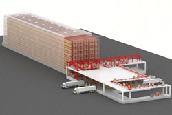 L’entrepôt sera autoportant et mesurera 135 mètres de longueur, 23 mètres de largeur et 26 mètres de hauteur. Il se composera de cinq allées de rayonnages à simple profondeur, qui seront desservis par des transtockeurs automatiques, chargés des opérations d’entrées et de sorties des palettes.