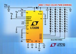 Le LT3599 emploie un seul commutateur interne de 45 V, 2 A, pour réaliser une source de courant constant, en mode élévateur. Toutefois, même lorsque la tension d’entrée VIN dépassera la tension de sortie VOUT, le LT3599 continuera à réguler l’intensité de la DEL. Le convertisseur élévateur interne possède une boucle de retour réglable pour réguler la tension de sortie à un niveau de tension légèrement plus élevé que celui nécessaire à la DEL, afin d’assurer un rendement maximum. Si une des guirlandes de DEL se trouve en circuit ouvert, le circuit continuera à réguler les autres guirlandes et enverra un signal d’alerte sur la broche OPENLED. Si des intensités de DEL plus élevées sont nécessaires, plusieurs sorties pour les guirlandes peuvent être connectées en parallèle, le convertisseur peut piloter jusqu’à deux guirlandes de 10 DEL, de 240 mA. Les autres caractéristiques incluent une protection programmable contre les surtensions, un détarage de l’intensité du courant de DEL en fonction de la température de jonction et / ou la température de la DEL et une protection contre les surtensions quand toutes les guirlandes sont déconnectées.