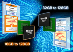Toshiba fabrique à la fois les mémoires flash et les contrôleurs déployés dans ses mémoires e.MMC et UFS. La société a également développé en interne le noyau analogique M-PHY 3.0 et le noyau numérique UniPro 1.6, qui sont intégrés au nouveau contrôleur UFS. Ainsi, le contrôleur est parfaitement adapté à la gestion de la mémoire flash cible, ce qui assure au dispositif des performances optimales.
