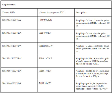 Les catégories de composants disponibles actuellement, conformes QML de classe V, sont les amplificateurs opérationnels RH1013 et RH1014, les amplificateurs opérationnels rail-à-rail de précision RH1498 et RH1499 et les références de tension RH1009 et RH01021-10.