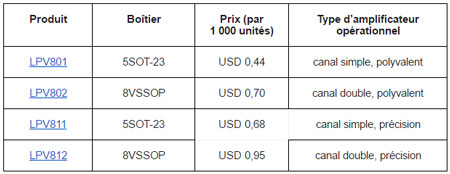 Les nouveaux produits du portefeuille d’amplificateurs opérationnels ultra-basse puissance de TI sont proposés dans les boîtiers et aux prix figurant ci-dessous :