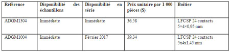Par rapport aux relais électromécaniques, les commutateurs haute fiabilité ADGM1304 et ADGM1004 multiplient par 10 la durée de vie en commutation à froid, ce qui augmente la longévité des équipements de tests automatiques et réduit les onéreuses périodes d’immobilisation provoquées par les pannes de relais. De plus, la très faible hauteur des boîtiers utilisés permet aux concepteurs de monter les commutateurs MEMS ADGM1304 et ADGM1004 en surface sur les deux faces de leurs cartes de tests ATE pour augmenter la densité des canaux à moindre coût sans accroître la surface occupée. Une pompe de charge intégrée évite de recourir à des circuits de commande externes, ce qui réduit encore les dimensions du système ATE, tandis qu’une configuration à multiplexeurs simplifie la structure de sortance (fan-out) par rapport aux relais à double contact inverseur DPDT (Double Pole-Double Throw).