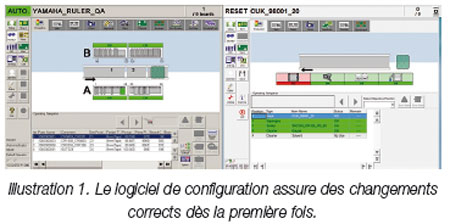 Grâce à cette possibilité, les changements de programmes peuvent être entièrement automatisés à partir de la détection de l’identité de la carte entrante, scannée directement sur le circuit ou sur une fiche de commande de production. Les changements automatiques incluent le choix des programmes corrects, l’ajustement de la largeur de convoyage et le replacement des pions de support de cartes. La vérification de la configuration recueille automatiquement les informations de brasage et de configuration auprès de la machine de sérigraphie et contrôle que les chargeurs dotés de tous les composants nécessaires soient bien installés sur les machines de report. Ces informations, consolidées dans un rapport consultable par le superviseur sur n’importe quel poste du réseau, améliorent l’efficacité et permettent d’identifier et de résoudre rapidement tout problème éventuel.
