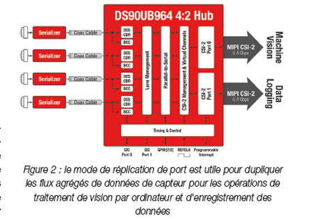 La réplication des données est possible à différentes étapes du trajet vidéo. Il est possible de connecter chaque capteur par des câbles séparés aux unités de vision par ordinateur et aux unités de commande électronique (ECU) d’enregistrement des données, mais cela double le nombre de câbles nécessaires. Au contraire, il est souvent plus simple de partager les données après l’agrégation des données du capteur. Par exemple, le hub désérialiseur quad DS90UB964-Q1 peut agréger les données brutes provenant de jusqu’à quatre capteurs différents et créer deux copies des données combinées sans composants externes tels que diviseurs et puces. Les algorithmes de vision par ordinateur (tels que la reconnaissance d’objet) peuvent traiter un flux, alors que l’autre flux est enregistré dans la mémoire pour l’enregistrement des données (Figure 2).