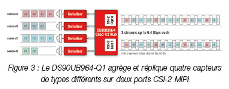 La Figure 3 présente un système à quatre caméras, avec des fréquences de données différentes illustrées par des blocs colorés. Les données agrégées sont présentées sur les ports 0 et 1 de l’interface série de la caméra (CSI)-2 MIPI. Le bus CSI-2 fonctionne avec des « salves », c’està-dire qu’il fonctionne à une fréquence de données fixe, libère par salves les données disponibles et revient à un état de basse puissance (LP) au repos. Ainsi, la vitesse du capteur peut varier sans modifier la temporisation du processeur de l’ECU. Bien que les liaisons du capteur fonctionnent à des fréquences indépendantes, le hub désérialiseur présente les données au processeur à système sur puce (SoC) sur une seule horloge de référence, simplifiant la temporisation du système.