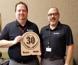 Le prix et la plaque honorifique pour le partenariat ont été remis par John Hallums, Président, et Tim Gannon, Directeur régional des ventes de Qualtek Electronics Corp., et présentés à Todd Jesme, Directeur de la division électromécanique, et Marc Kaluza, Chef de produit chez Digi-Key